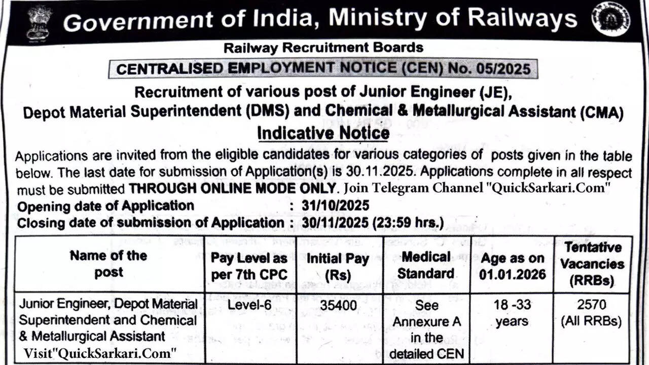 EducationRRB JE CEN 05/2025 notification out: Apply online for 2570 JE, DMS and CMA posts from 31 October via Latest Education news – Board Exam Results, Admit Cards, Exam Paper Analysis and Question Papers | Times of India https://ift.tt/gscX81J Author jobnagar100 View all posts Share this:FacebookX Related